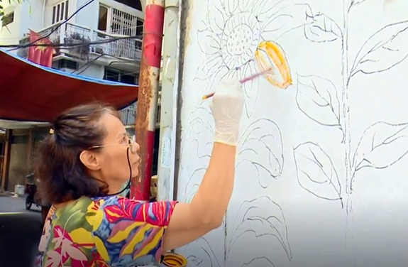 Đến phường Trung Phụng, quận Đống Đa ai cũng biết bà giáo già Đào Ngọc Huấn vẫn lọ mọ vẽ tranh ở những điểm chân rác tường, dù đã hơn 70 tuổi. Không chỉ vẽ tranh, bà còn sáng tác thơ vần về ý thức bảo vệ môi trường trên mỗi bức ký họa để người dân thiếu ý thức tự cảm thấy ái ngại khi vứt rác.