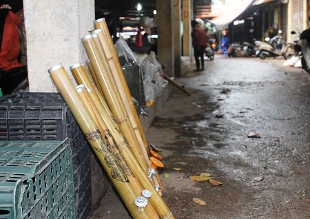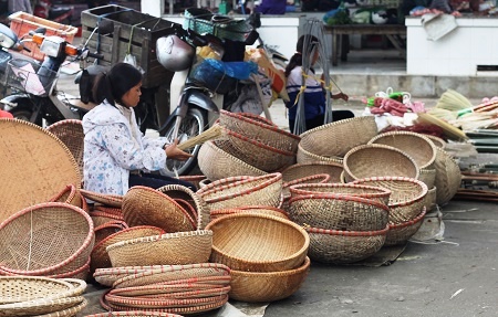 | Các loại rổ rá, thúng, nong, nia và sản phẩm đan lát cũng chiếm một phần lớn diện tích chợ. |