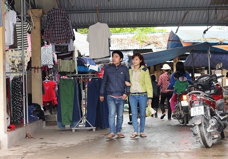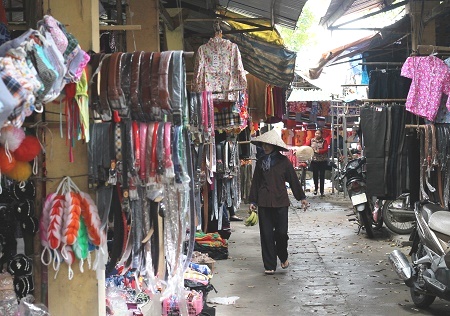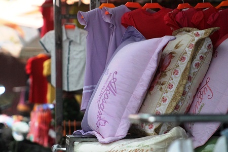 | Ngoài nông cụ và các sản phẩm nông nghiệp, quần áo, chăn, ga, gối, đệm cũng được bày bán. |