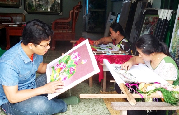 NNND Nguyễn Quốc Sự: Bao giờ cũng vậy, cuộc sống con người cần những nhu cầu sinh hoạt thiết yếu trước, sau mới nghĩ đến việc thưởng thức nghệ thuật. Trong điều kiện kinh tế-xã hội có nhiều biến động, hoạt động du lịch dịch vụ trầm lắng, tranh thêu không phải là sản phẩm hút khách. Thế nên, thị trường tiêu thụ là điều khó khăn nhất hiện nay. Hầu hết các xưởng tranh thêu phải chật vật tìm đầu ra cho sản phẩm. Một số cơ sở tranh thêu truyền thống không đủ sức cạnh tranh đã chuyển đổi sang kinh doanh lĩnh vực khác, số còn lại hoạt động ở mức cầm chừng. Thu nhập từ nghề thêu chỉ ở mức trung bình trong điều kiện sinh hoạt ở nông thôn nên nhiều người đã bỏ nghề để kiếm việc làm tại các khu công nghiệp. Trong khi đó, những thợ có tay nghề cao ngày một ít đi, còn lớp trẻ ở địa phương thì không mặn mà lắm với nghề thêu tay.