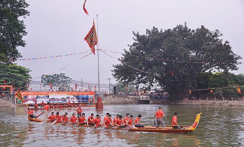 Thuyền bơi được đưa xuống dòng sông Pheo để ngâm thuyền phục vụ cho hội bơi. |