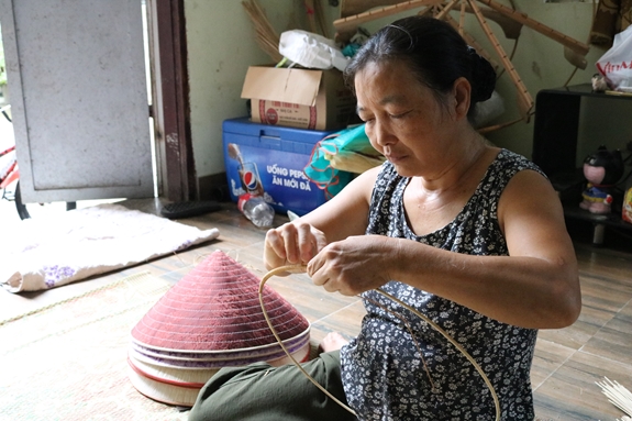 Nghệ nhân Lê Thị Phương tỉ mỉ trong từng công đoạn làm nón. |