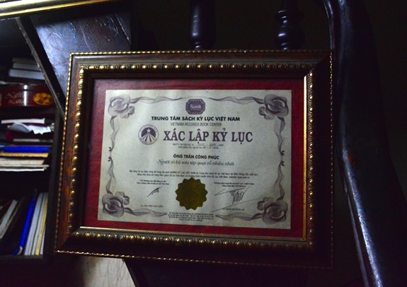 Niềm đam mê và tài năng của ông Phúc đã được Trung tâm sách kỷ lục Việt Nam xác lập kỷ lục “Người có bộ sưu tập quạt cổ nhiều nhất”. |