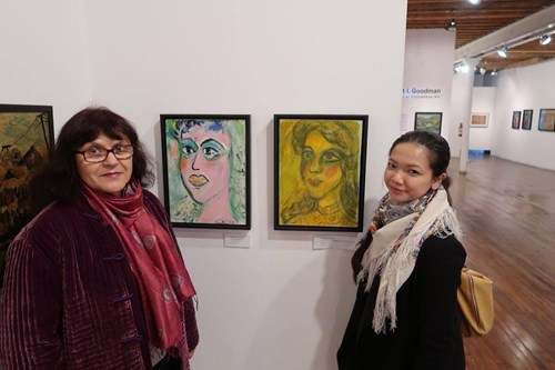 Bà Natasha (bên trái) đứng cạnh tác phẩm chân dung của mình được chồng-nghệ sĩ Vũ Dân Tân vẽ. Ảnh: Vũ Ngọc